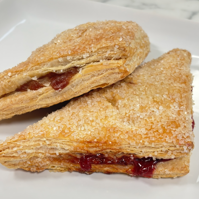 Sugar coated puff pastry filled with an apple pie or cherry pie filling.